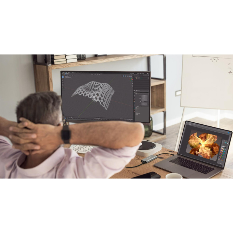 Завдяки пропускній здатності до 40 Гбіт/с, динамічним даним та розподілу пропускної здатності дисплея для ефективного потоку даних ви можете легко створити конфігурацію монітора високої роздільної здатності. Насолоджуйтесь роздільною здатністю до 8K і швидшим доступом до даних без впливу на продуктивність системи. Крім того, він має три порти USB SuperSpeed+ 10 Гбіт/с (1 USB-C і 2 Type-A) для заряджання або підключення периферійних пристроїв. Він також оснащений портом USB-C Power Delivery для заряджання ноутбука та підключених пристроїв потужністю до 100 Вт.