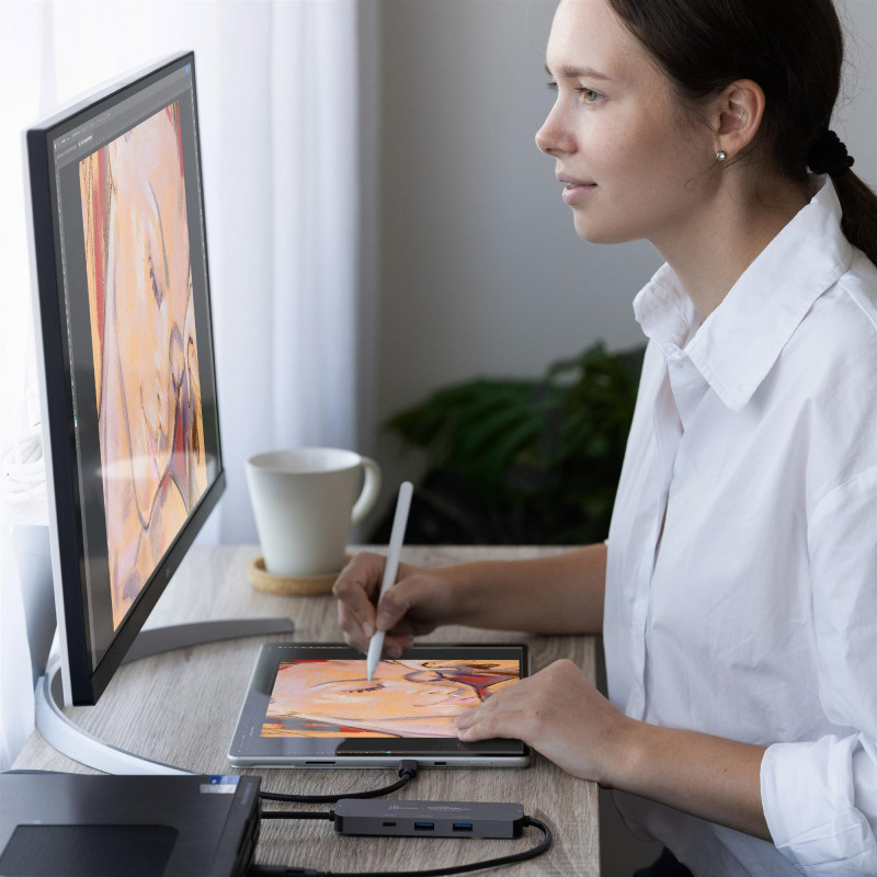 Цей хаб також підтримує спільний доступ до екрана, що дозволяє без зусиль розширювати або дублювати екрани між двома пристроями Windows. Він також підтримує віртуальний мультитач, жести Windows і стилус при використанні з планшетом із сенсорним екраном, що підвищує продуктивність і загальний комфорт роботи з сенсорним екраном.