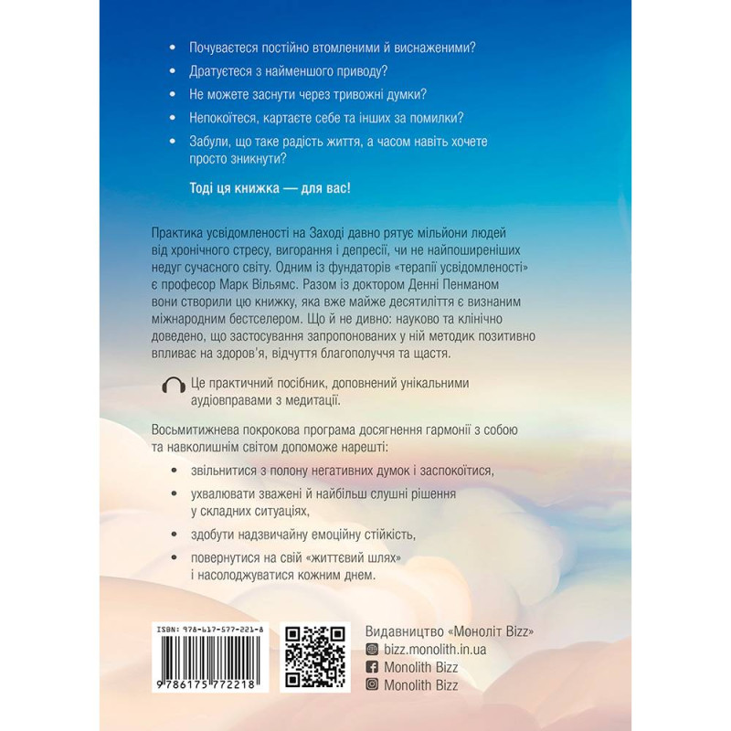 Практика усвідомленості на Заході давно рятує мільйони людей від хронічного стресу і депресії, чи не найпоширеніших недуг сучасного світу. Сьогодні і в Україні вона стрімко стає популярною. Одним із фундаторів «терапії усвідомленості» є професор Марк Вільямс. Разом із доктором Денні Пенманом вони створили цю книжку.