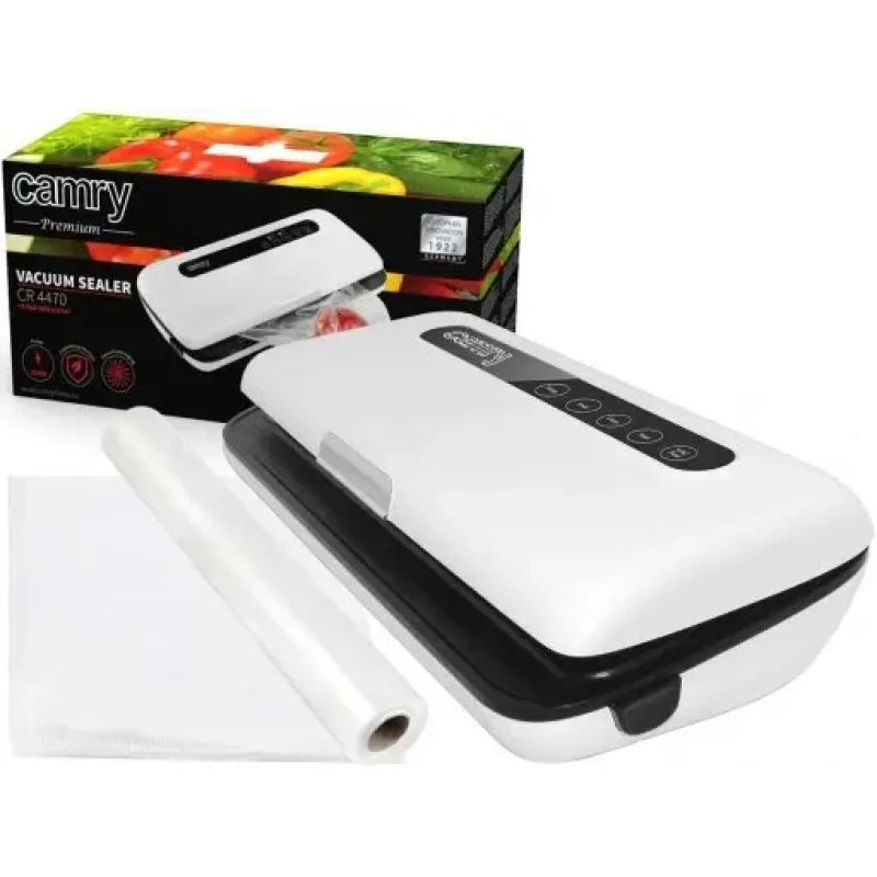 Швидкості витяжки 2: Стандарт і М'яка (для ніжних продуктів) Режими DRY (для сухих продуктів), MOIST (для вологих) Електронна панель управління Зі світлодіодними індикаторами Способи роботи Вакуум з запаюванням, запаювання без вакууму Нагрівальний елемент для запаювання 30 см Фіксація кришки Кнопками Ніжки Прогумовані Продуктивність повітряного насоса 12 л / хв Шланг для висмоктування повітря з контейнерів Так (аксесуари можуть не входити в комплект) Пакети та рулон 5 пакетів (20x30 см), 1 рулон плівки (20x200 см) Харчування 220-240 В, 50-60 Гц Потужність 110 Вт Розміри вакууматора 14.5 х 36 х 7.5 см Вага 2.3 кг Вакууматор Camry CR 4470 — це надійний та ефективний прилад для пакування продуктів, який дозволяє зберігати їх свіжими на довгий час. Потужність 110 Вт і продуктивність повітряного насоса до 12 л/хв забезпечують швидку та якісну вакуумну упаковку, що значно продовжує термін зберігання продуктів. Вакууматор має два режими роботи: DRY для сухих продуктів і MOIST для вологих, що дає можливість обирати оптимальні умови для кожного типу продукту. Крім того, пристрій підтримує два варіанти витяжки повітря: стандартний та мякий, який підходить для ніжних продуктів, таких як ягоди чи мяса. Електронна панель управління з LED-індикаторами дозволяє легко налаштувати вакууматор, а функція запаювання і вакуумування забезпечує ефективне герметичне упакування. Вакууматор також підтримує режим запаювання без вакууму, що є ідеальним для упаковки сухих продуктів або інших предметів, де не потрібен вакуум. До комплекту входять 5 пакетів розміру 20х30 см і 1 рулон плівки довжиною 20 м, що дозволяє одразу почати користуватися пристроєм. Пластиковий корпус з прогумованими ніжками забезпечує стійкість і зручність при роботі з вакууматором, а компактні розміри (14.5 х 36 х 7.5 см) дозволяють зберігати його в будь-якому місці. Завдяки вакууматору Camry CR 4470, ви зможете зберігати продукти свіжими і безпечно упакованими, а його надійність і простота у використанні роблять його незамінним помічником на кухні або в магазині.