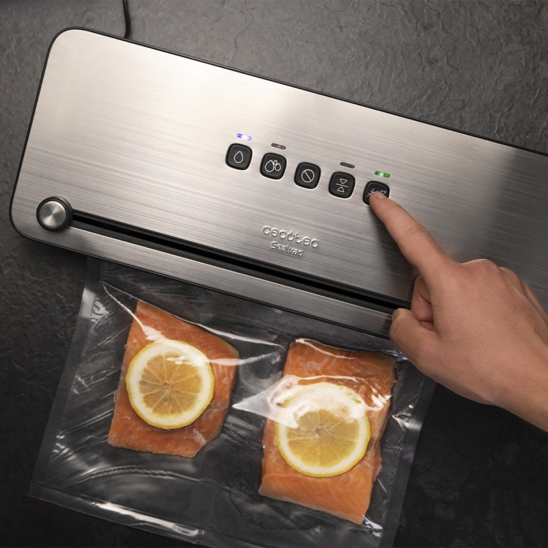 Упаковуйте будь-які продукти легко і швидко з вакуумною машинкою CECOTEC SealVac 140 SteelCut. Вона має відмінну швидкість роботи, вбудований ніж і диспенсерний резервуар для пакувального матеріалу. Високий тиск 0,75 бар дає змогу більш щільно спаювати пакет і надійно зберігати свіжість їжі.