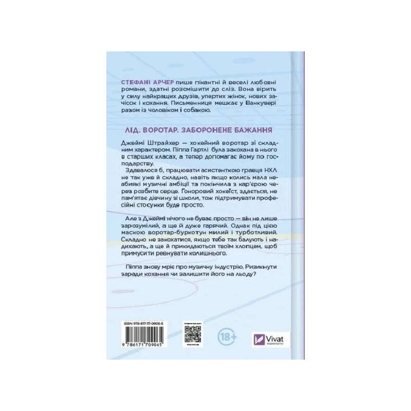 Книга «За сіткою» — це історія в антуражі хокейної романтики від канадської письменниці Стефані Арчер. У головної героїні Піппи Гартлі непрості часи: хлопець грубо обійшовся з нею та покинув, сказавши, що її мріям про кар’єру співачки ніколи не судилося здійснитись. Дівчина намагається рухатися вперед і знаходить роботу. Відтепер вона асистентка Джеймі Штрайхера — зухвалого красеня із жахливим характером, який є новим воротарем команди «Ванкувер Шторм».