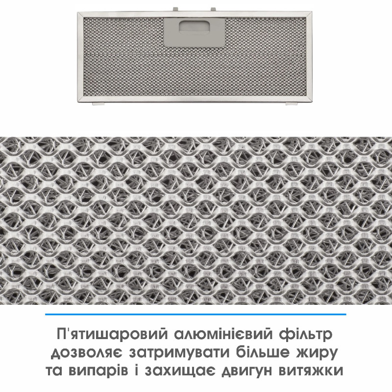 Надійний 5-шаровий алюмінієвий фільтр поглинає жир, грязь, дрібні сторонні частинки та захищає двигун витяжки. Для легкого очищення його достатньо виймати та помити у гарячій воді чи посудомийній машині.