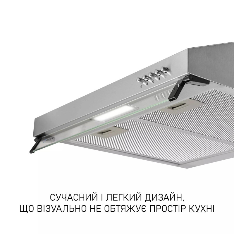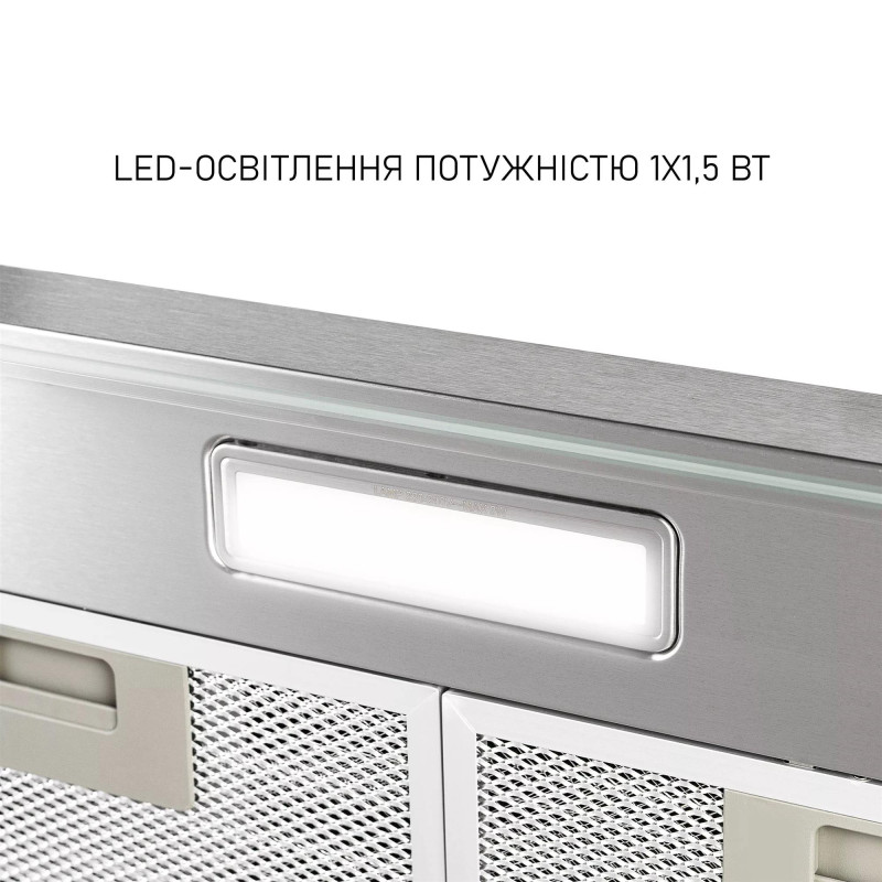 Minola HPL 622 I — функціональна плоска витяжка із неіржавної сталі і з ефектним скляним козирком, що здатна освіжити повітря на кухні до 20 м2. Вона поєднує стильний індустріальний дизайн із продуктивністю 450 м3/год, що швидко очищає простір. LED підсвітка підвищує зручність приготування, економлячи електроенергію. Ця модель зручна в експлуатації й має інтуїтивно зрозумілу систему кнопкового управління.