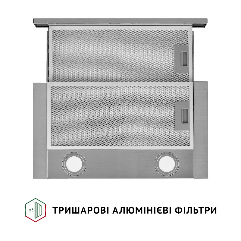Витяжка обладнана двома тришаровими алюмінієвими фільтрами, які ефективно захищають мотор та інші деталі пристрою від забруднення жиром і випарами. Їх можна легко вимити в теплій мильній воді або в посудомийній машині.
