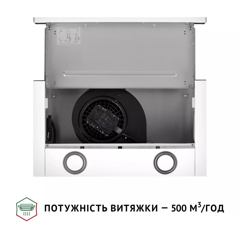 Освітлення витяжки складається з двох LED-ламп, потужністю по 1.5 Вт, які розташовані на задній частині витяжки та сприяють кращому освітленню робочої поверхні. Підсвічування є комфортним для очей і працює як додаткове джерело освітлення на кухні. Робочий ресурс світлодіодів у рази вищий, ніж у звичайних ламп, а споживання енергії мінімальне. Крім того, світлодіоди досить витривалі під час активної експлуатації.