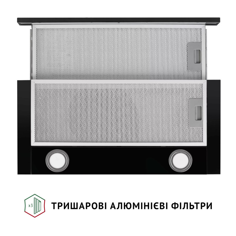 Витяжка обладнана двома тришаровими алюмінієвими фільтрами, які ефективно захищають мотор та інші деталі пристрою від забруднення жиром і випарами. Їх можна легко вимити в теплій мильній воді або в посудомийній машині.