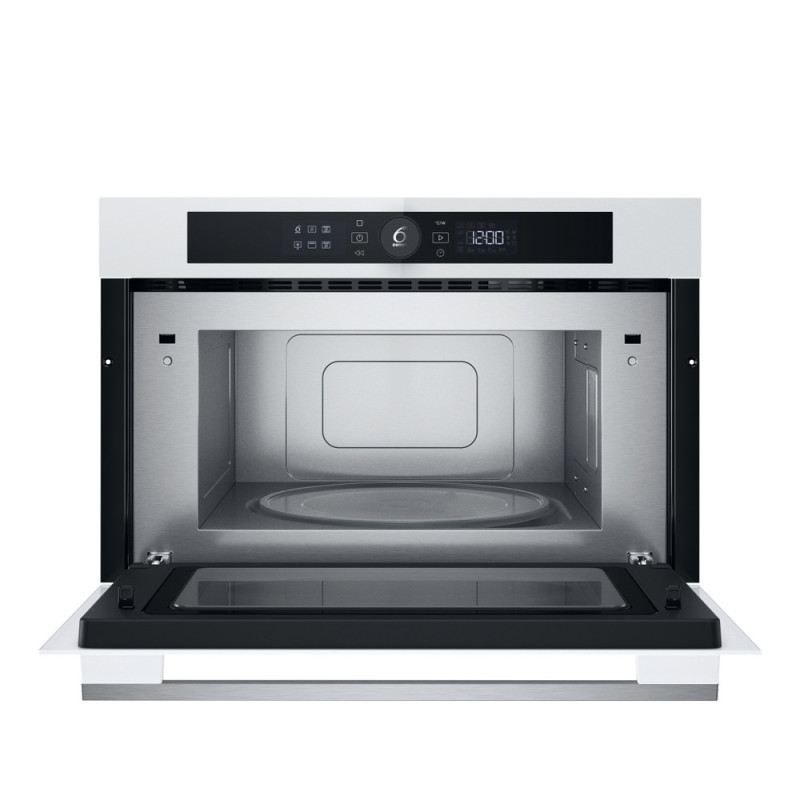 Whirlpool WMD54MW — вбудована мікрохвильова піч об'ємом 31 л з електронним поворотним керуванням, потужністю мікрохвиль 1000 Вт та кварцовим грилем 800 Вт. Підтримує режими мікрохвилі, гриль, Crisper (хрустка корочка), швидкий старт, таймер. Внутрішнє покриття — нержавіюча сталь, дверцята відчиняються вниз, піддон 32,5 см. Білий корпус, габарити 38,5×59,5×46,8 см (для ніші 38×55,6×55 см). Надійна модель для швидкого розігріву, приготування та грилю у сучасній кухні.