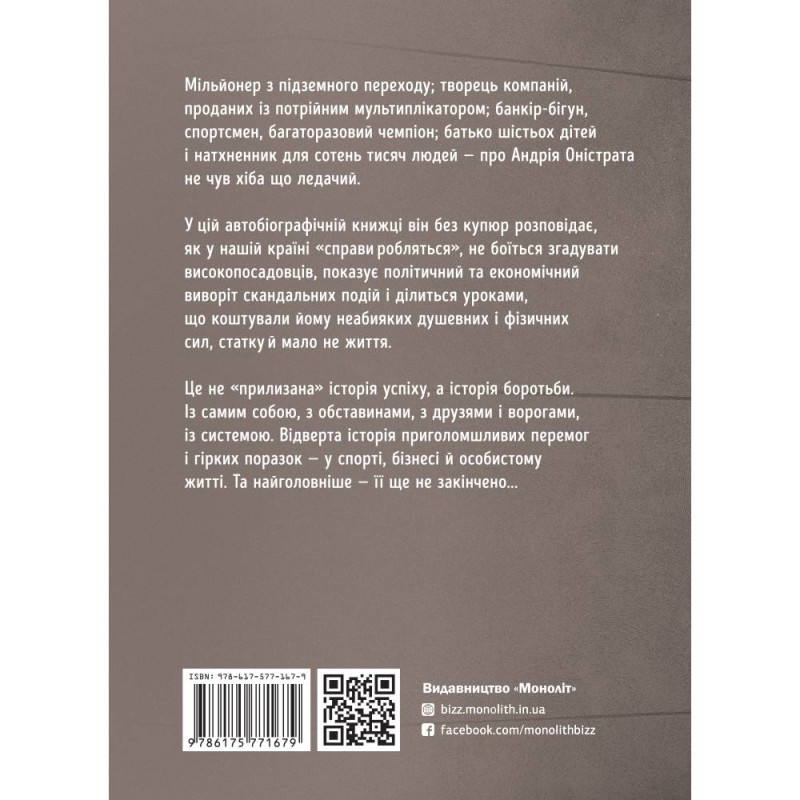 У деяких історіях більше питань, ніж відповідей. Але не сьогодні, не в цій книзі! Андрій Оністрат розповідає відверто про сокровенне. Відомий український бізнесмен, спортсмен, Ironman, youtuber, коуч, батько шістьох дітей — без натяків і прикрас ділиться історією свого життя. Зліт, тріумф, падіння, крах ... усвідомлення, новий старт, віра, завзятість і ... успіх!