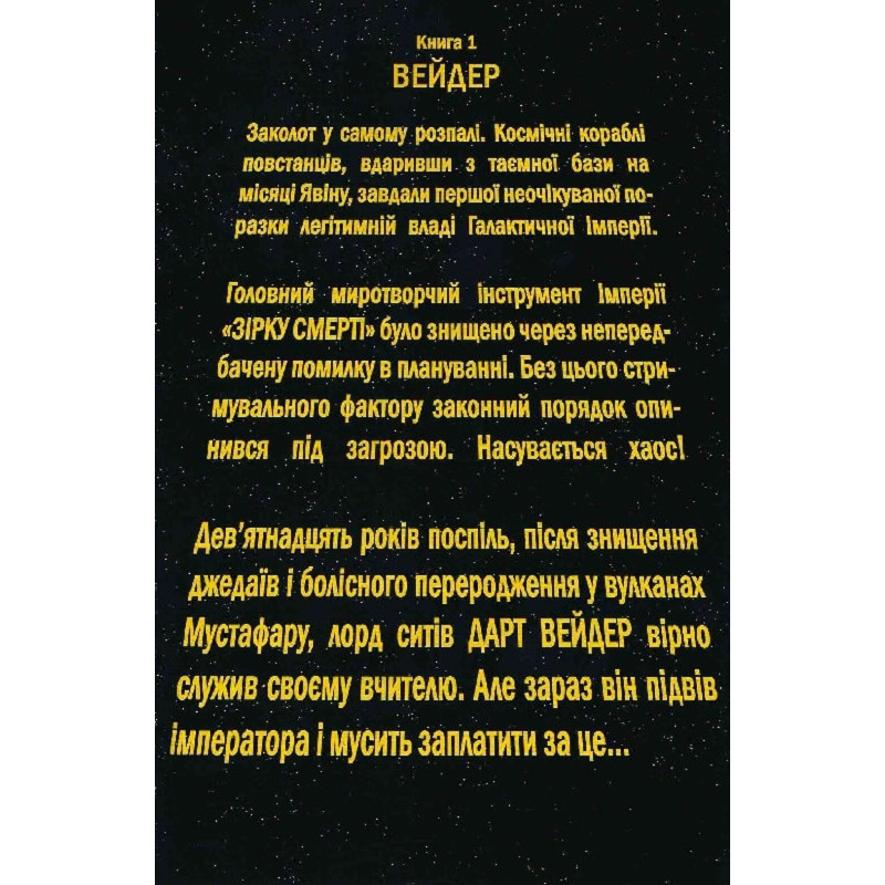 Відколи Дарт Вейдер вперше з’явився на екрані, він став одним з найзнаменитіших лиходіїв популярної культури. Тепер вирушайте разом із ним одразу після подій Нової надії (і сторінок його власної серії) у нову подорож, яка покаже війну Імперії проти повстанців з іншого боку! До кого звернеться темний лорд, коли потребує допомоги? У гонитві за особистою помстою повстанцям і розслідуванням таємних задумів Імператора, Вейдер натрапляє на брухтарку зброї Афру і смертоносних бойових дроїдів, а також повертається на Геонозис, аби зібрати армію. Але деякі могутні люди не хочуть, аби він довідався правду! Зіркові гості випуску – Джабба Гатт, Боба Фетт та інші!